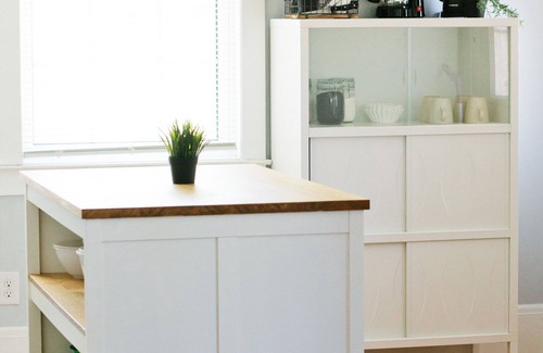 To the left of the yard, stairs lead up to this apartment . Step inside to discover a fully stocked kitchen equipped with modern appliances, including a full-size refrigerator, stove, oven, microwave, and coffee maker. A butcher block island provides extra counter space for meal prep or casual dining.