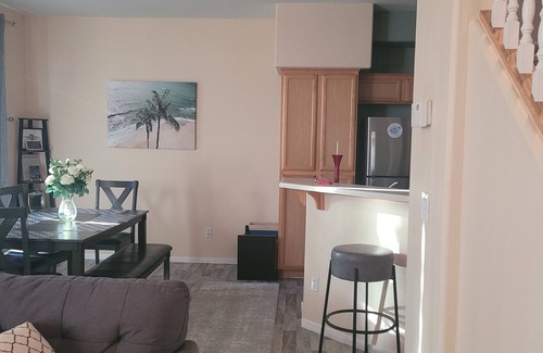 Stay at this unpretentious and spacious 2 story, 3 bedroom 2.5 bath home in a wonderful North Las Vegas neighborhood! Easy Self Check In with Digital Lock. Kitchen is equipped for cooking so let your inner chef come out to play! Just remember to clean up after :) Large Master Bedroom with King Bed and Ensuite Bath with Soaking Tub. Both smaller bedrooms have comfortable Queen Size beds. Upstairs laundry room. Backyard with BBQ (Guest responsible for Propane). 2 Car Driveway and Garage. Comfortable living room with Smart TV. Dining table seats 6. Supermarket, drug store, restaurants, dispensary and shops all within easy walking distance!