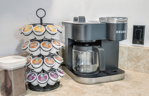 The wet bar/coffee bar is equipped with snacks, coffee & tea (Keurig can be used pot style for a large number of coffee drinkers, or by the pod for individuals.) There are gourmet teas (please use only what you need while you stay), snacks, and condiments.