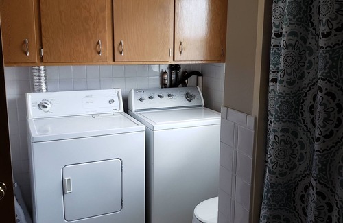 This cozy apartment is located in a very quiet neighborhood on the second floor through a private entrance. You'll enter through the kitchen into a bright open concept kitchen/dining room and living room space. The main bedroom has a queen size bed, bureau, closet, and desk. The second bedroom is furnished with a full-size bed with drawers, bedside table, and closet. The spacious bathroom conveniently has a full-sized washer and dryer and full bathtub.