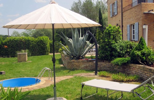 The high-quality furnished cottage has a secluded location with a stunning panorama view in the hilly landscape of the March. If you are looking for tranquillity and you want to relax in between vineyards and olive groves, you will be able to experience a relaxing holiday here. There is a garden with Mediterranean plants and fruit trees available. For refreshment, there is a solar shower and a 2m round diving pool. From the two partially covered terraces you can enjoy the romantic sunsets. It is about 15 km to the sea. In Grottamare you will find well-kept open beaches with showers. Open air opera events (9 km away) will pamper people interested in culture. Sport lovers can swim, sail, bicycle, hike in the national park of the Sibillin Mountains, go mountain climbing and drive with the fishers out to the sea. The historical old city can be reached in a two minute drive. There you will find restaurants, bars, a doctor and a pharmacy.