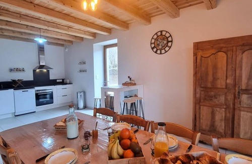 Discover "La maison de campagne" for 10 people, completely renovated, this 160m² cottage offers all the necessary comfort for a friendly stay. On the ground floor, a large, bright living room invites you to relax in front of the wood stove, while the open, perfectly equipped kitchen opens onto a friendly and spacious dining room. The upper floor serves four welcoming bedrooms, two modern bathrooms and a separate toilet. This cottage combines the charm of old stones with contemporary comfort. Nb: the exterior of the cottage is currently being developed to soon offer a green and welcoming setting: the lawn is growing ;) A vacation rental with hiking and discovery in Gumières in the Loire! The Monts du Forez offer an incomparable playground for nature and outdoor lovers. From the cottage, explore the hiking trails, hop on your mountain bike to crisscross the forest paths, or opt for a peaceful bike ride. The region's natural wealth makes it a privileged place to recharge your batteries! Lovers of eco-tourism will be delighted by the authentic landscapes and the diversity of activities.