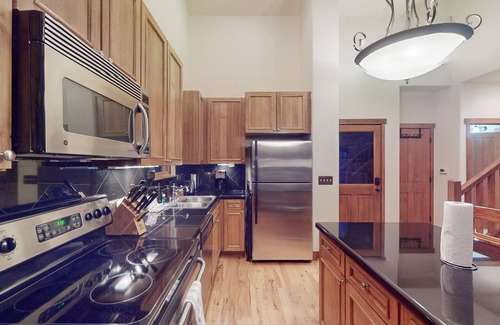 Inside, the spacious living room welcomes you with comfortable seating, a TV, and a cozy gas fireplace, creating the perfect ambiance for relaxation after a day of outdoor adventures. The dining table seats 6, with additional barstool seating, and the fully stocked kitchen with modern appliances allows you to whip up delicious home-cooked meals during your stay.