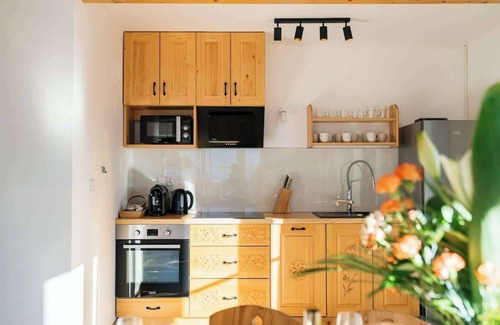 The kitchen set with a separate dining room includes a chair where you can eat and eat meals. The kitchenette is fully equipped, including: kettle, coffee machine, fridge, oven, dishwasher and equipment such as plates, cups, glasses, pots. Guests can prepare their own meals.