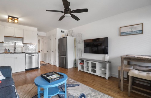 From the moment you enter Fin's Watch, natural light pours in through wide windows and a glass balcony door, welcoming you with an instant sense of ease. The living area is thoughtfully furnished for relaxation, featuring a plush sofa and a large smart TV to keep you connected or entertained between beach days.