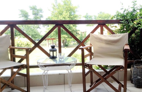 Our summer house consists of two bedrooms: on the ground floor, one with queen size bed and the other one with two single beds and a futon, as well as a bathroom with shower. The upper floor has a spacious, ethic decorated, luminous living room with an attached fully equipped kitchen, and a WC. There are two balconies, a large outdoor shaded terraced area and lots of garden space that may used as playground.