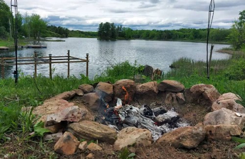 Glamping bunkie with direct view of the lake to help you relax and enjoy your time away from home. Equipped with microwave, mini-fridge, water dispenser and Keurig machine. Queen bed in the loft and two singles in the main level. Basic dishes provided. Huge windows overlooking the lake and all the canoeing, swimming and fishing you want steps away from the door. Outdoor flushing toilet restroom and outdoor shower. Private outdoor area with table & chairs and fire-ring with free wood.