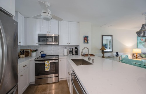 The open first floor plan with half bath and comfortable décor lends well to the casual lifestyle of Key West. Your newly renovated kitchen with stainless-steel appliances and Quartz countertops seamlessly flows to the dining and living areas allowing you to enjoy the well outfitted kitchen while entertaining friends, sipping your favorite beverages, and enjoying good conversations. Double French doors draw you out to the private lush tropical garden and deck.