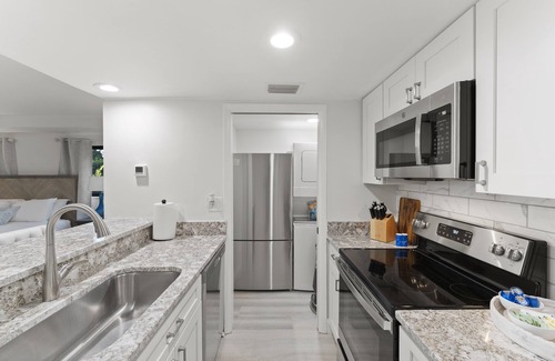 The fully equipped modern kitchen makes it easy to prepare meals or snacks. With stainless steel appliances, sleek white cabinetry, and a breakfast bar that seats two, you’ll have everything you need for a relaxing stay, from morning coffee to a late-night bite.