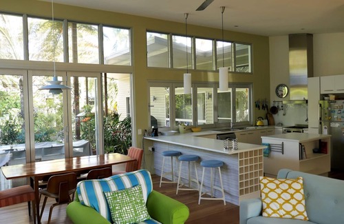 The home boasts cool and elegant native timber floors throughout and two state of the art bathrooms each with walk-in, combined “rain” and hand-held showers and heated towel rails. The living, dining and kitchen areas are open-plan (with reverse cycle air-conditioning) whilst the 3 bedrooms are private and all look out over either front or back gardens. A study is also available to access a Wi-Fi printer or for the use of a desk. All bedrooms contain comfortable beds, tri-speed ceiling fans and large built-in wardrobes and shelving. The bedroom containing single beds also has a wall mounted TV. Perfect for the kids.