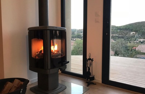 As part of a new architect villa, this completely independent cottage has a large private parking space at its feet. Very well equipped, with free wifi and sheets and towels provided, it has a living room with fitted kitchen, 3 bedrooms, a bathroom with walk-in shower, sink and wc, as well as an additional separate wc. Watch the sunset and enjoy the wooden terrace with its private sunny pool and barbecue gas cart with stove. Admire the very landscape from the inside with its large picture window, and enjoy the warmth of the wood stove during the winter period.