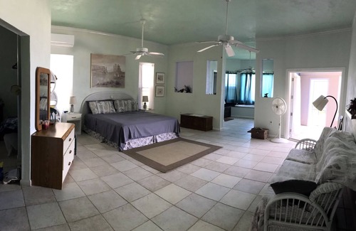 The master bedroom is large, large enough that the king size bed looks oddly small in it, French doors open out to the porch area so the tropical breezes blow through in the evening. Off the bedroom is a large marble bathroom, with "his" and "her" sinks, a rain shower and three bay windows looking out, yet again, over the sea in front. The master bedroom has the split AC unit.