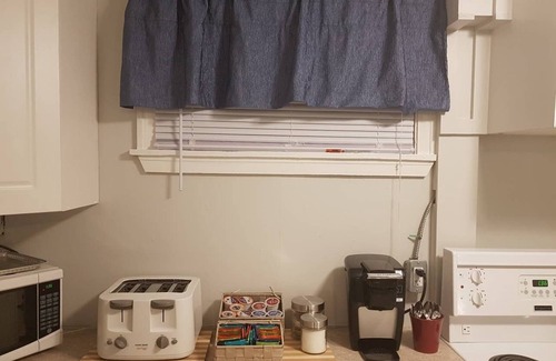 This "back to basics" space offers simple and sturdy furnishings. The apartment has it's own private entrance, fully stocked kitchen (with pots/pans/dishes), designated parking space and access to laundry facilities just on the other side of the door - no change of level required.