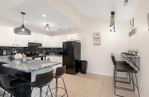 Unwind at this stunning conveniently located one story condo! The family room features beautiful laminate flooring, vaulted ceilings, and a unique stonewall covered fireplace for a luxurious, yet charming feel. Enjoy the black and white features throughout the house, and dimmable touch lamps in each bedroom. Tucked just a stone's throw away from lively shops and delectable eateries, this inviting 2-bedroom haven is the quintessential home base for your short-term sojourn.