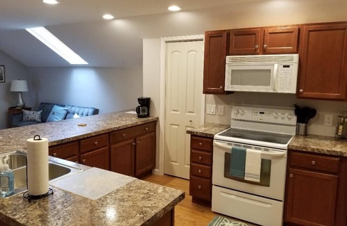 Second floor walk up apartment one block from town square. Two bedrooms, each with full size closets, one queen bed, one full. Full bath with washer/dryer. Large living area with convertible sofa bed. Large fully furnished kitchen. Walk out deck from back bedroom has patio table and chairs for outdoor dining. All bed linens and towels provided. Wireless internet, smart TV with cable in living area and one bedroom. Two assigned parking spaces. Private entry.