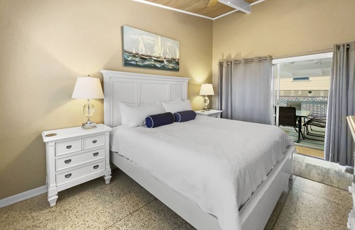 On the first floor, you will find a large bedroom with a king-sized bed and a full bathroom. This bedroom is detached from the main house and has a private entrance and patio where you can enjoy your morning coffee. This room is perfect for those guests who want their private living space or don't wish to climb stairs. This room has a refrigerator, microwave, and coffee maker.
