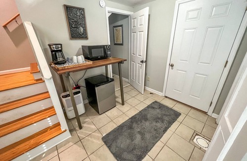 Climb the steps to the upstairs and you will find two more bedrooms with a shared bath with tub/shower combo. One bedroom features a king bed with twin bed, spacious closets, and a flat screen TV. The second bedroom features a queen bed with flat screen tv.