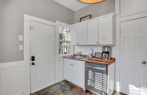Decorative twin fireplaces, common in the historic railroad cottages on East Jones Street, flank the couch, a perfect blend of history and modern luxury. Original wood flooring and barn-style doors give the space a rich, unforgettable character. Connected to the master bedroom is a small study with seating and a desk, perfect for the digital nomad. Guests love the slate floors in the light filled kitchen, which has access to your private courtyard.