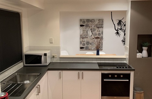 Kitchen - modern kitchen with breakfast bar and separate dining area. Includes: dishwasher, oven, microwave, kettle, toaster, ample storage, glasses & plates. Superbly stocked kitchen. A high chair and port-a-cot is provided for those with babies/toddlers. The kitchen over looks the backyard & deck, which is handy to keep an eye out while the kids play.