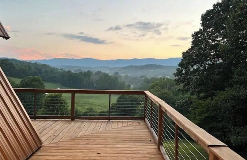 Unique A-frame built on a bluff over-looking rolling hills and the Blue Ridge Mountains. 3 bedrooms and a loft allow for 8 guests to have a dedicated bed. But you can add 2 more if you use the air mattress. A luxury level hot tub, fire pit, corn hole and basketball arcade allow for relaxation and fun. Sit on one of the three decks and take in the sounds of nature. Watch the deer and turkey roam the fields through the binoculars. Listen to the sounds of the Smith River from the front deck.