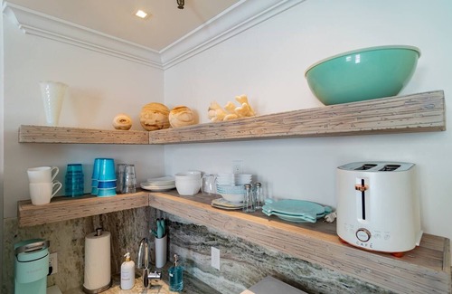 Welcome to this newly renovated Coral Reef King Suite with high end designer furnishings. Featuring colorful koi fish in coral reef wallpaper by Manual Canavos under the large straw hat light. Kitchen is fully equipped with a retro full size refrigerator/freezer. Promises to pick up your spirits as you enter the door. Remote control black out shades, king bed with storage drawers. Custom closets by California closets. This most charming suite promises to pick up your spirits as you enter. This suite has been completely renovated and all newly designed with a modern-retro feel.
