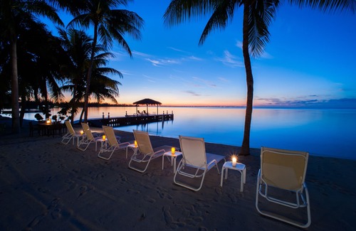 Once you enter, your eyes are drawn through the living room's 16-foot wall of windows and out to the white sand beach and shimmering calm blue water. The palm-shaded barefoot beach is dotted with 6 lounge chairs, two hammocks, an outdoor shower, a private dock, plus an outdoor dining set and propane grill for beach cookouts.