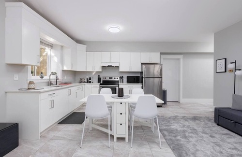 Welcome! Our modern semi-basement suite offers a comfortable stay with two spacious bedrooms featuring queen-size beds, a cozy living room with a sofabed, TV, and a dining area. The suite boasts a fully equipped kitchen with a fridge, stove, microwave, essential cooking utensils, and in-suite laundry for added convenience. The clean and well-maintained bathroom ensures a refreshing stay. Perfect for families, business travelers, or small groups looking for a relaxing and private space.