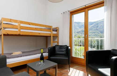 "Villaggio Sureggio - App. C16", 3-room apartment 65 m2 on 2nd floor. Comfortable and cosy furnishings: living/sleeping room with 1 x 2 bunk beds (80 cm, length 200 cm), satellite TV (flat screen). Exit south facing position and east facing position. 1 double bedroom with 1 double bed (2 x 80 cm, length 200 cm). Kitchen (oven, dishwasher, 4 ceramic glass hob hotplates, toaster, kettle, electric coffee machine, Capsules for coffee machine (Nespresso) extra) with dining table. Shower/WC. Electric heating. Natural stone floors. Patio. Terrace furniture, deck chairs. Very beautiful, of the mountains and the countryside. Facilities: iron, hair dryer. Internet (WiFi). Reserved parking space n 33 (extra). Please note: suitable for families. Non-smokers only. Private entrance. NL-00007945