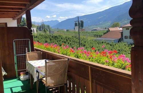 The cosy holiday apartment on the Bioland - certified farm in the village Castelbello-Tschars impresses with its view of the mountains of South Tyrol and is located in the middle of the Vinschgau Valley, surrounded by orchards and nature. The apartment has a living room/kitchen, a well-equipped kitchen, a bedroom and a bathroom and therefore offers space for 2 persons. WLAN, cable and satellite TV are also available. A cot and a high chair are also available. Start your morning with a cup of coffee and the beautiful mountain views from the private and covered terrace. The large garden with a wooden garden house, deckchairs, a table, a bench and a barbecue is shared with the other guests of the farm. The nearest restaurant and a bar are only a few minutes walk away. Some supermarkets, as well as other restaurants and cafés are within 3 minutes by car in the centre of the village. If you arrive without a car, you can walk from the accommodation to the nearest bus stop or train station. Bicycles can also be rented for excursions. On your arrival you will receive the "Vinschgau Card", with which you can use public transport free of charge and get discounts for many leisure activities. You will also receive free admission to the "Erlebnisbad Naturns" including sauna.