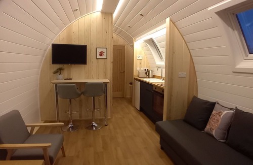 The cabin sleeps 4 people with one private room with double bed and 1 double sofa bed. Bedding and towels will be provided for the number of guests that are booked into the cabin. It has an en suite bathroom with a shower, toilet, sink, and heated towel rail. The kitchenette is fully equipped with a fridge, microwave, toaster, kettle, hot plate, oven and sink. There's also a breakfast bar with 2 stools, an electric heater, TV, and a local information pack.