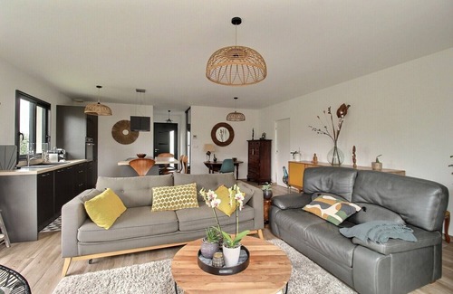 The house, recent (built in 2021) welcomes you in a living space of about 35m2, composed of a kitchen equipped with oven, induction hob and dishwasher.