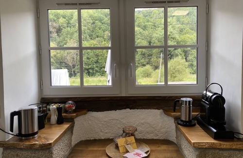 The ancient bread oven building has been restored with care and respect, recycling and incorporating reclaimed materials where feasible. The bed is made from the old beams and recovered planking as are the window sills and table top.