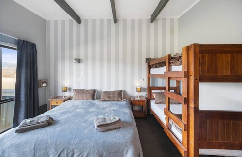 Self-contained motel-style room with king-size bed, a set of bunk beds and ensuite bathroom.