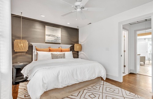 The primary bedroom includes a luxurious king-sized bed and thoughtful decor. The large dresser provides ample storage. We included a smart tv in this bedroom for streaming with your services.