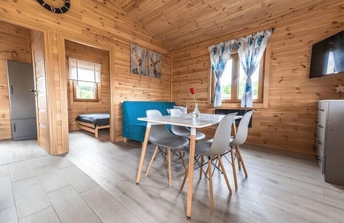 Comfortable, year-round wooden cottages in Duszniki Zdrój. The cottages are located on a hill with a panoramic view of the city. Each cottage has: 2 bedrooms with double beds, a fully equipped living room (sofa bed, TV, table), kitchenette (fridge, kettle, induction hob, kitchenware, set of dishes and kitchen accessories), bathroom with shower. Each cottage has a 12 m2 coffee terrace. In addition, the facility includes: a playground, unguarded parking, Wi-Fi, ski rack on the terrace. Guests also have access to the SPA zone (tub and sauna). The external Spa Zone is prepared exclusively for Guests, requires reservation and is additionally payable (1 hour PLN 200, 2 hours PLN 320, 3 hours PLN 420). Guests have the option of buying breakfasts in the form of a Swedish buffet. Breakfasts are served in our Bistro Przyjaciółki Restaurant on the premises of the resort. Children up to 1 year old - free Children over 1 year old up to 12 years old - PLN 35/breakfast Children over 12 years old and adults - PLN 50/breakfast.
