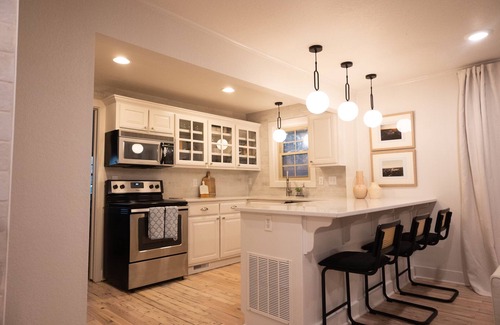 The newly remodeled Stadium Cottage is a light-filled studio home with a plus one bedroom with twin bed and a Queen pullout. The original floors and stylish design are only surpassed by its location. You will wake up in the shadow of Razorback Stadium. With a king bed, twin in the back mini bedroom, and a fold out full, you and up to four close friends can have a magical weekend in Fayetteville. A charming back porch is the perfect place to enjoy a morning cup of coffee overlooking the UofA.