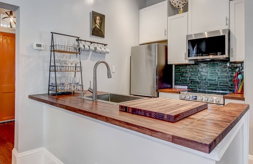 After getting cozy in the living room, it's just a few steps to the home's lovely "mod" dining table that shines in the sunlight from a nearby window. Next, the home's designer kitchen with butcher-block island provides a perfect spot for whipping up meals, snacks, and cocktails. The kitchen comes equipped with sparkling appliances. Guests can feel right at home when making use of their own refrigerator, stove, dishwasher, coffee maker, microwave, toaster, and cooking essentials. Once guests are done being dazzled by the kitchen, they can move to the home's show-stopping king and queen bedrooms. The first bedroom in Cottage at Thomas Square is a dream for anyone seeking Savannah vacation rentals with plenty of closet space. A large walk-in closet that's filled with natural sunlight is the perfect spot for choosing outfits for Savannah sightseeing. The second bedroom delights anyone seeking luxury as a top priority when choosing Savannah vacation homes. This large, sunny room features a stunning antique fireplace. Of course, the luxury reaches a new level in the home's bathroom. Featuring both a shower and soaking tub, the cottage's bathroom is an oasis. A vanity featuring a vessel sink allows for plenty of shared space in this roomy powder-room retreat.