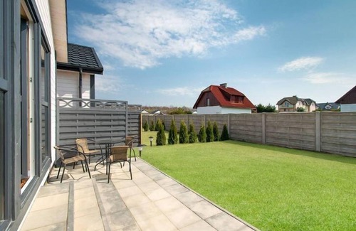 Professional and attractively equipped holiday resort 650 meters from the beach, on the outskirts of a quiet seaside settlement (Łazy), in the immediate vicinity of Lake Jamno. Comfortable, single-storey holiday homes. Each with a terrace (garden furniture set) and a small, private garden. The cottage has a living room with a double sofa bed and TV, a 3-person bedroom, a kitchen and a bathroom with a shower. Electric heating. Wireless internet is available. On the fenced area of the resort there is an attractive playground for children, a secure car park, a table tennis table. Barbecue equipment is available on site (there is a barbecue gazebo, a place for a bonfire). In the resort you can use the washing machine (for a fee). You can come to the resort (for a fee) with a dog, but only so-called gentle breeds are allowed. The price of your stay includes: bed linen, internet, final cleaning, a high chair and a baby bath (on request). In the immediate vicinity you can find many recreational facilities, restaurants and cafes. The international R-10 cycling trail runs nearby, which makes it easy and convenient to get to other nearby seaside towns by bike. The resort is located in the immediate vicinity of Lake Jamno, but convenient access to the water is approx. 600 m away. In the neighbouring Mielno you can rent water equipment (water bikes, kayaks, rowing and sailing boats) allowing for in-depth exploration of this body of water. There are also fishing spots here.