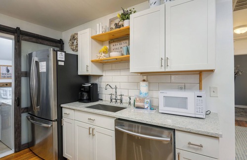 This well-appointed cottage features a comfortable living room with 55” flat screen Smart TV, cable, and internet. The dining room and well-equipped kitchen have been designed in an open floor plan with the living room. The laundry room, just off the kitchen, features a full-sized washer and dryer, 2 bicycles to explore the area, and a separate entrance.