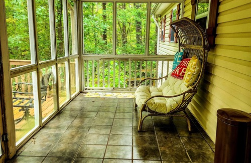 With a fully stocked kitchen, meal preparation is easy. You can enjoy meals inside or outside. Enjoy your coffee on the back deck or screened in back porch as well, while surrounded by swaying trees and peace. A Blackstone grill is provided if grilling out is your thing!
