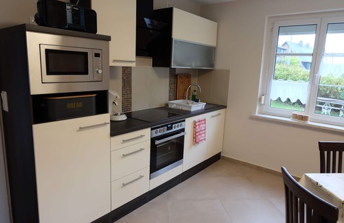 The environment is very quiet and there is no street noise. The apartment is located in one half of the house built as a semi-detached house. The other half is inhabited by the landlords. Which is very useful for questions, tips and requests. The apartment is laid out on 2 floors (ground floor and upper floor). It is completely renovated, about 80 square meters and offers many highlights. Like a private sauna, lovingly furnished children's room, large kitchen and much more.