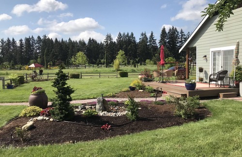 2 bedroom 2 bath house. Spacious 1 acre to enjoy. Fire pit, beautiful sunrises off the deck in the morning. Very private despite being a guesthouse. Host home is fenced so there is division. All the space for this home is private from host. With deck and fire pit being on opposite end of house. Whether you are a small family or a couple looking for a getaway. This is the perfect spot. Mt Rainier park is a 40 min. drive with multiple hikes or view spots for picnicking. Several lakes within 20 minutes. Northwest trek is 30 mins. Town of Yelm with many fabulous dining options is just a 5 minute walk. There is a movie theater 5 minute walk with good food and cocktails in their lounge for 21 and over. Wonderful environment. Casa Mia for family friendly dining as well as our favorite la Guitana pizzeria, and several Mexican restaraunts to choose from. A wine bar in the park plaza as well. There is also a live theater if you enjoy the arts. We have prairie days carnival in june in the summer with a parade, and Christmas in the park in the winter, including a parade. Puyallup which holds washington state fair is also just 40 minutes away. If your adventurous, there is no limit to your fun. If you just want a getaway. We truly believe you'll enjoy this home. We have set up The home like a condo with board games.. and a home away from home feel, so you will be as comfortable as possible and are willing to help with anything you may need. The master bedroom has a king bed. We are a family with 8 children, so we are fairly versed in that area of expertise and can help with places to visit and sites to see. We also truly enjoy getting away on dates and have many recommendations for couples as well. If you are from out of state, Seattle is 1 hour and 15 minute drive. Portland is 1 hour 30 min. If you’re looking for big city adventure for a day.