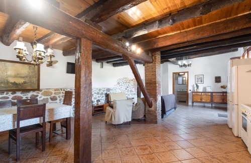 It has 9 rooms, 3 of them triple, 1 quadruple, 1 double and 4 multiple rooms (we open some or others depending on the total number of people). It also has 6 bathrooms, equipped kitchen, TV, fireplace, with wooden furniture similar to past times. Outside there is a garden with barbecue sheltered from the sun or rain by a porch and swimming pool (only in summer).
