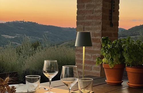 Casa Collina is a charming stone house built from rustic materials in the traditional Italian style with beams made from chestnut wood and terraccota tiles on the floor. The house has a breathtaking position at the top of a ridge with a full view of the valleys below. The house consists of a big kitchen/dining area and a small cosy living room with an open fireplace. There are two bedrooms with double beds and two bathrooms. Furthermore, it is possible for two people to sleep in a sofa-bed situated in the living room. On the first floor there is a large balcony. Outside there is a large covered terrace and a swimming pool, which is open in the summer season. Casa Collina is fully insulated and has a central heating system, which means that it also is suitable for stays outside the summer season. The house is placed in quiet surroundings near the little village San Terenziano, but not in any way isolated. The perfect place for a family holiday or a romantic get-away.
