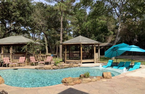 Take it easy at this private and tranquil getaway located 40 mins from downtown Houston this property has 6200 Sq ft of living space , located on a 1.7 acre property with a wonderful private pool and a jacuzzi built in to the deck area , three gazebos a main house and a separate casita with a game room for royal entertainment or events , this unique property offers comfort and excellent entertainment potential , the main house has 2 main masters and 3 very comfortable bedrooms , the guest house has a complete kitchen , bathroom and a 1 bedroom with a king size bed, the outdoors offers a monster main deck with two additional gazebos the main deck is equipped with a large smart TV and a sound system, the game room has a professional pool table set up , a small kitchen and bathroom to insure all the privacy for those who want to stay up later at night, a true private resort for large groups with comfort.