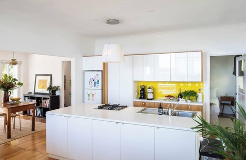 Featuring a fresh, white palette and timber accents, this beautifully appointed stay offers the perfect base for couples or solo travellers who wish to discover the Mornington Peninsula. You'll be greeted by an open-plan layout that is both functional and inviting. A modern kitchen featuring a cheerful yellow splashback has everything needed to cook meals, while a mezzanine level provides a light-filled dining space complete with a four-seater table overlooking the balcony. Here you’ll also find the cosy lounge area, offering a calm retreat to kick back with a book or settle in on the sofa with your favourite Netflix series.
