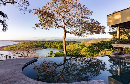 If view matters, this is IT! So close to 2 beaches (Playas Pelada and Nosara - both just a couple minutes stroll down the hill) that the ocean sounds will constantly surround and soothe you. This home and area is tranquil and unique because it is within the wildlife refuge yet very close to restaurants and all Nosara has to offer. The attached guest house sits at the end of Playa Pelada, 30 meters above the river mouth looking down the black sand beach of Playa Nosara at the Ostional turtle sanctuary. The view is of the beach and also of the most amazing estuary where two rivers (Montana and Nosara) come together and flow into the Pacific. The view then continues up into the mountains. There is no better view anywhere with the constant changing of the estuary, waves rolling in, fabulous bird watching and the abundant wildlife. This is a rare home inside the wildlife refuge. The top floor attached guest home is 1000 sq feet with 1 bedroom with a king bed and 1 full bath, large covered deck and a sofa in the living area. Ideal for couples. Nicely decorated, air conditioned bedroom, private and secure. You will not want to leave. The pool (shared with us if we are there and one other 1 bedroom apartment) has a fantastic infinity edge showcasing the view, a spa bench with jets and a beach area to lounge in!