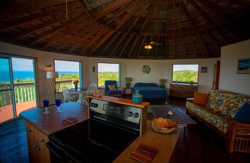 This do-decagon (12 sided) home with its large screen windows, cantilevered ceiling, and full wrap-around deck provides the ultimate lodging for true Caribbean living. Casa Cima del Mundo (Top of the World) features a one room open design plan that brings the natural beauty of its surrounding inside, creating a truly dynamic living space. Sweeping ocean vistas, views of nearby and far off islands, breezy trade winds, and thoughtful and comfortable accommodations all meld together gracefully ,making this home your perfect choice for a fabulous vacation. Spacious• Intimate •Amazing
