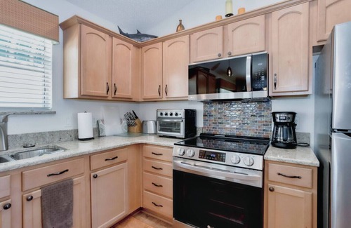 The primary suite offers a serene retreat after a day of fun, complete with a private bath and ample closet space. The second bedroom provides a cozy space for guests, while the third bedroom is thoughtfully set up as an office and exercise space. With an exercise bike included, you can stay productive and fit during your stay.