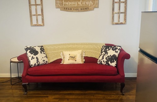 County Ranch life with cows in all 4 directions, outside fire pit, bbq pit, plenty of parking, come get your R&R on, as you enter the maroon door into our kitchenette you will find a dining/work table, full refrigerator, microwave, coffee bar area, and a couch. (NO Kitchen SINK)